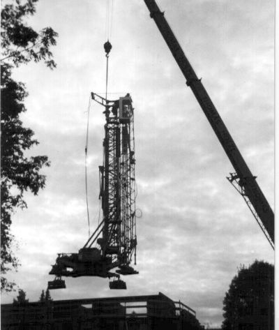 Eine sehr Anspruchvolle Aufgabe! Der 40mt Kran von Potain wurde Teilmontiert auf der Baustelle umgesetzt. Zum Einsatz kann dabei ein 130t Autokran. Durch diese vorgehensweise war der Betrieb der Baustelle nur einen Halben Tag unterbrochen.